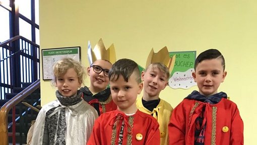 Die Sternsinger des Orteils Bildstock, Mädchen und Jungen unserer dritten Klassen, kamen auch in die Hoferkopf Grundschule und besuchten alle Klassen.