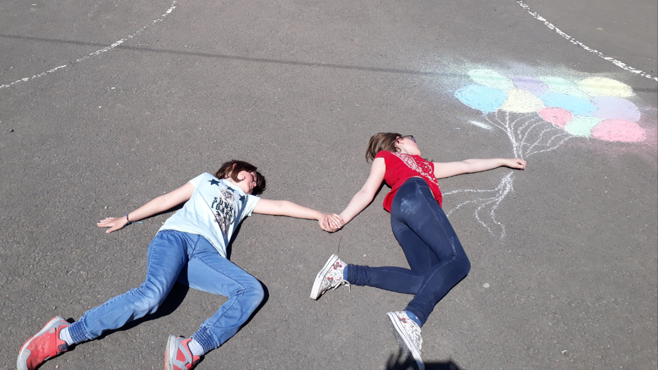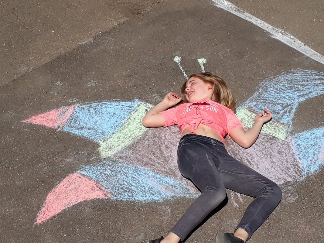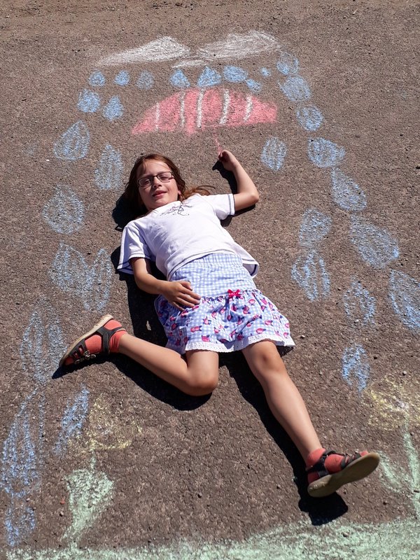Die Kinder der AG "Künstlerisches Gestalten" haben mit Straßenkreide gemalt und sich danach in ihrem Bild fotografieren lassen. Das Ergebnis ist sehenswert, darum wollten wir es Ihnen nicht vorenthalten :-)