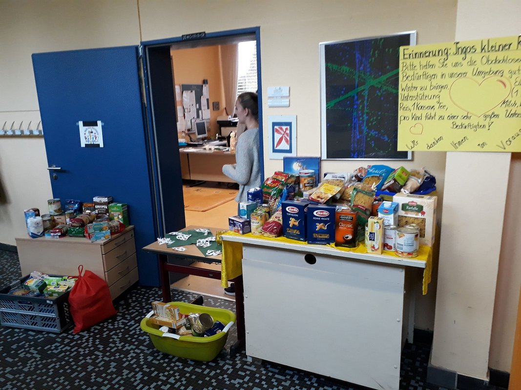 Neu in diesem Jahr war die von den Kindern organisierte Spielzeugbörse. Die ausrangierten Spielzeuge der Kinder konnten gegen eine freiwillige Spende erworben werden. Der Erlös kam den Klassenkassen zu Gute. Den „Verkauf“ leiteten selbstverständlich auch die Kinder selbst und hatten dabei jede Menge Spaß. Zudem sammelte die Grundschule in diesem Jahr Lebensmittel für einen guten Zweck. Für „Ingos kleinen Kältebus“, der sich für Obdachlose engagiert, spendeten Kinder und Eltern fleißig Nudeln, Mehl, Milch, Wasser und vieles mehr. Dabei kam einiges zusammen.